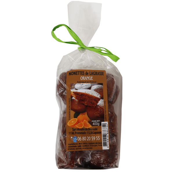 Ingrédients : Miel (50%), farine, cassonade, lait, confiture d'oranges, huile d'olives, épices, bicarbonate.
