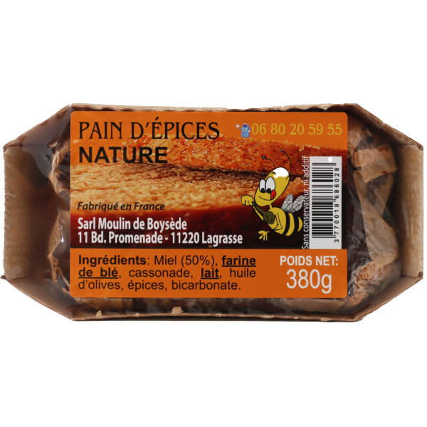 Ingrédients : Miel (50%), farine de blé, cassonade, lait, huile d'olives, épices, bicarbonate.